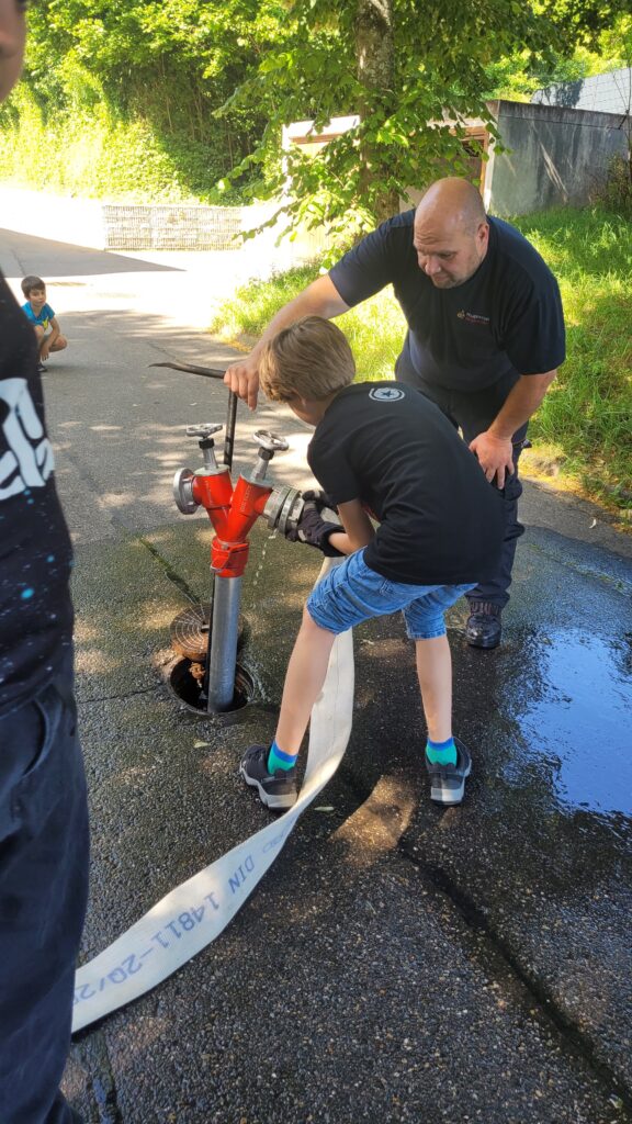 Besonders spannend für die Kinder waren natürlich die beiden Einsatzfahrzeuge und die jeweiligen Ausrüstungen der Einsatzkräfte. Ein weiteres Highlight war eine Station der Feuerwehr, an der die Kinder dabei helfen durften, einen Feuerwehrschlauch an einen Hydranten anzuschließen. Mehrmals hallte an diesem Morgen lautstark der Befehl „Wasser marsch“ über das Schulgelände.