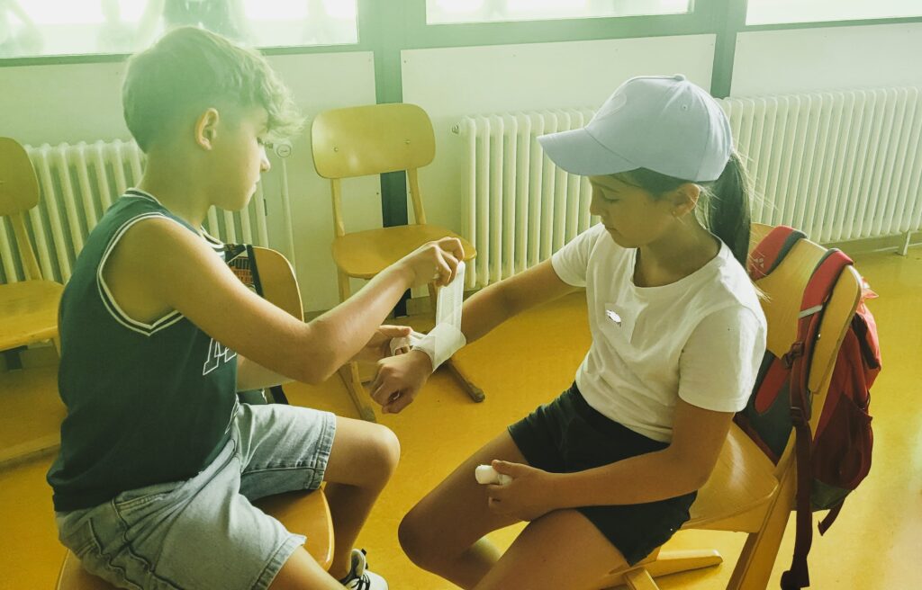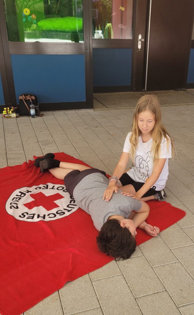 An den weiteren Stationen lernten die Kinder das richtige Absetzen eines Notrufs und was es mit dem Verbrennungsdreieck auf sich hat. Außerdem konnten sie das korrekte Anwenden der stabilen Seitenlage und das Verarzten kleiner Wunden üben.